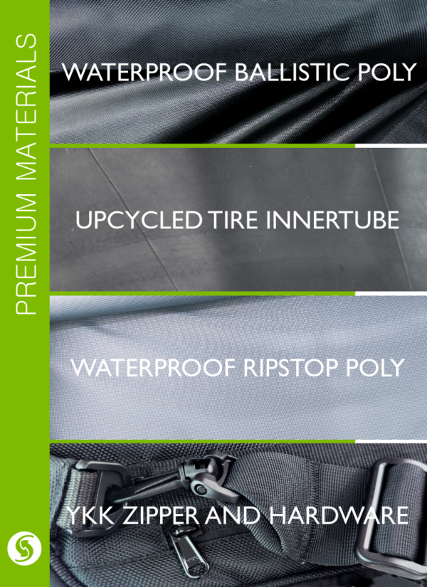 - Upcycled tire inner tube rubber: This adds waterproofing and impact protection to your belongings.